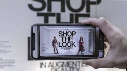 El escaparate de la tienda de Zara parece vacío. Sobre un fondo blanco, unas letras grandes negras invitan a comprar: “Shop the look” pone. Visto a través del móvil, la imagen es bien distinta. Con una aplicación de Zara instalada, apuntando con la cámara del teléfono, de golpe aparecen en escena dos modelos. Las mujeres, a tamaño real, bailan y pasean por el escaparate con la última ropa de la compañía. En realidad no están ahí. Son producto de la realidad aumentada, la misma tecnología que causó furor con el videojuego de Pokemon, que permitía ver y cazar monstruitos por las calles a través del teléfono.