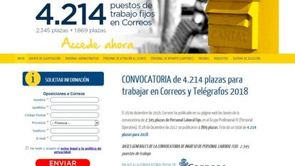 Si uno teclea "Correos" y "trabajo" u "oposiciones" en cualquier buscador de internet, lo primero que le va a salir es una página que usa la información oficial de la compañía sobre sus convocatorias de empleo y que ofrece "información" a quien rellene un breve formulario. Es fácil confundirla con la web oficial. En realidad, los datos llegan a academias que ofrecen cursos para preparar la prueba por unos 1.000 euros. Parte del engaño consiste en prometer un trabajo que aún no existe y omitir los dilatados plazos entre la oferta de plazas y el examen oficial (el de la convocatoria de 2016 aún no se ha realizado).