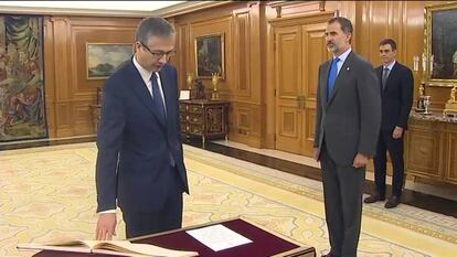 Pablo Hernández de Cos promete en Zarzuela ante Felipe VI su cargo, para el que fue propuesto todavía por el Gobierno del PP