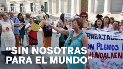 En la manifestación frente al Congreso del miércoles, grupos de mujeres blandían fregonas o escobillas del baño al grito de “Porque sin nosotras no se mueve el mundo”. Las protagonistas de la jornada admiten que la nueva oleada feminista que el pasado 8 de marzo llenó las calles españolas de mujeres ha dado nueva fuerza a sus reivindicaciones. “Los cuidados han sido uno de los ejes fundamentales de las marchas feministas. Y ahí se incluyen tanto los que se prestan en las familias como los que hacen las trabajadoras. Hace falta una reorganización de la sociedad que tenga en cuenta la absoluta feminización e invisibilización de los cuidados. Las dos luchas están muy ligadas”, opina la abogada Slepoy.