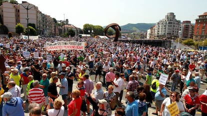 "Mi abuela tiene una pensión muy baja y no quiero eso". Centenares de niñas y niños como Izaro, de 11 años, han acompañado hoy a sus abuelos en una nueva exhibición de los jubilados vascos. Bajo un sol considerable, otro lunes, pero esta vez de agosto y en plenas fiestas de Bilbao, decenas de miles de pensionistas han reclamado una pensión mínima de 1.080 euros y han pedido al Gobierno de Pedro Sánchez que les tenga muy presentes ahora que se aproxima la decisión sobre el techo de gasto para los presupuestos de 2019.