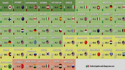 Por su parte, Madrid ha conseguido "una ligera mejora" en todos los atributos racionales que conforman la reputación. "Esta mejora de posición refleja claramente que la percepción que se tiene sobre Madrid está vinculada a la buena percepción que hay sobre España", explica el Reputation Institute. Así, la capital ha pasado de la posición 21 a la 19, pero también ha descendido ligeramente su calificación: de 77 puntos a 76.1, y se sitúa por detrás de Barcelona. Los factores de "Vivir"y "Trabajar" han registrado las mayores subidas: 2,36 puntos y 1,93, respectivamente.