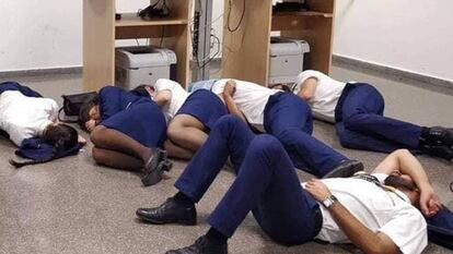La aerolínea difunde un vídeo en el que demuestra que la foto de los tripulantes de Málaga durmiendo en el suelo estaba preparada. El sindicato admite que fue una “escenificación visual”