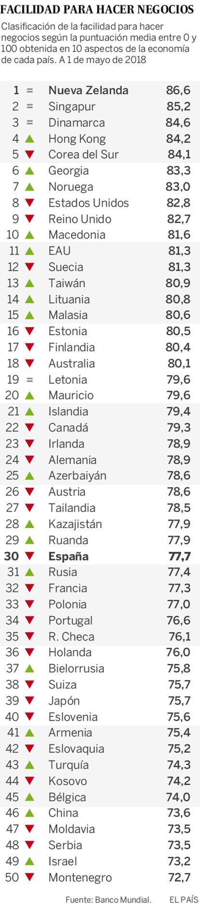 El país donde es más fácil hacer negocios entre los 190 territorios analizados es Nueva Zelanda, igual que el año pasado. Obtiene 86,59 puntos sobre 100, exactamente lo mismo. Le siguen Singapur, Dinamarca, Hong Kong y Corea. Para llegar a España hay que bajar hasta la posición 30, dos por debajo del anterior análisis. Saca un 77,68 puntos, que son 0,07 puntos más que un año atrás.