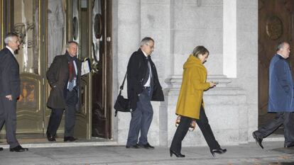 El pleno está convocado a las 10. Minutos antes de la hora, cada magistrado se sienta en el sitio que le marca el protocolo. En el estrado, el presidente de la sala, Luis María Díez-Picazo, ocupa el sillón central, en el que habitualmente se sienta el Rey en los actos de apertura del año judicial. A su lado, los ponentes de los recursos sobre los que se va a deliberar: a la derecha Nicolás Maurandi, presidente de la sección segunda, experta en tributos y responsable de la sentencia del 16 de octubre. A la izquierda, Francisco José Navarro, de la sección tercera. Al lado de estos se sientan el resto de magistrados según su antigüedad dentro del alto tribunal. Cuanto más veterano, más cerca del estrado. Si miran hacia arriba, ven un techo abovedado con vidrieras y un fresco de Marcelino Santa María que representa a la Justicia triunfando sobre el mal.