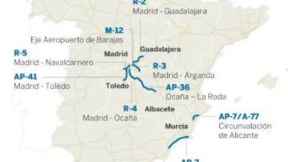 Las autopistas señaladas por el titular de Fomento son las cuatro radiales de Madrid: la Madrid-Toledo, la que une la capital con el aeropuerto de Barajas, la Ocaña-La Roda, la Cartagena-Vera y la Circunvalación de Alicante. Estas carreteras de pago quebraron durante la crisis por falta de tráfico y el Ministerio de Fomento las rescató a comienzos de este año. Desde entonces las gestiona a través de su sociedad pública Seittsa.