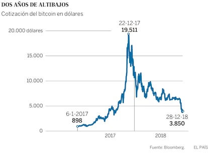 En 2017, el bitcoin alcanzó un valor que poco tiempo atrás parecería de ciencia ficción. El 17 de diciembre rozó los 20.000 dólares. El pasado viernes rondaba los 3.850. En 12 meses, su capitalización ha pasado de 300.000 millones de dólares a 67.000. Si este parece un gran desplome, otras criptodivisas ha experimentado uno aún mayor. A principios de diciembre, el ethereum —la segunda más extendida— había perdido un 94% de su valor. En las últimas semanas se ha recuperado algo, hasta los 129 dólares, pero sigue a una distancia sideral del máximo de 1.431 dólares del pasado enero. “La subida de 2017 no respondía a ninguna explicación racional asociada al valor real. Era solo una burbuja especulativa, lo que se confirma con la agresiva corrección de 2018, pues de nuevo no hay unas causas objetivas que la expliquen”, resume Juan Pedro Gravel, socio de Estrategia Tecnológica de Deloitte. Y aunque ahora esté en mínimos respecto a sus niveles récord, su valor es aún un 300% superior al de principios de 2017.