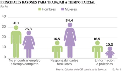 La geográfica no es la única variable que analiza la OIT. La brecha de género queda a las claras al comprobar la diferencia de los motivos que esgrimen los y las trabajadoras para optar por un contrato a tiempo parcial. El 34% de las mujeres tienen contratos de pocas horas para dedicar más tiempo a responsabilidades familiares como el cuidado de hijos, mientras que en los hombres este porcentaje cae al 16%. “Una vez más, estos resultados subrayan la importancia de políticas públicas orientadas a aliviar la carga de las responsabilidades familiares que a menudo impiden a las mujeres participar al 100% en el mercado laboral”, dice el informe de la OIT.