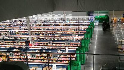 Aunque el proyecto se basa en la tecnología y el comercio electrónico, la primera impresión es que la colmena es en realidad como un supermercado. Uno enorme en el que trabajan con cerca de 8.000 referencias. Dentro de una nave industrial. A lo largo, 10 pasillos con estanterías a los lados ocupan el espacio. Arriba una serie de carteles divide a su vez esos pasillos en módulos. Y en cada estante, esperan todos los productos. En un lateral del espacio, neveras de congelados. En el otro, cámaras para los frescos, la zona de carne y pescado y un área de panadería. Y en la parte frontal, un espacio amplio y desnudo, con líneas amarillas y blancas pintadas en el suelo, junto a las grandes puertas de almacén. Ahí se colocarán las torres de cajas con los pedidos ya preparados para ser cargadas en las furgonetas, una flota de unos 40 vehículos.