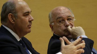 Jaime Ponce, presidente del fondo de rescate, FROB, recibió multitud de alabanzas por el trabajo de la institución. Entre ellas, de la ministra, Nadia Calviño.
