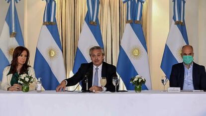 “Durante años, Argentina no puede pagar nada”, dijo Martín Guzmán, rodeado por el presidente Alberto Fernández, la vicepresidenta Cristina Fernández de Kirchner y numerosos gobernadores provinciales. La puesta en escena fue solemne. También lo fue Fernández cuando advirtió a los argentinos de que los próximos 20 días, el período durante el cual los acreedores en moneda extranjera deben decidir si aceptan o rechazan la propuesta, serían turbulentos: “En este periodo va a haber gente jugando muy fuerte. Hay muchos intereses en juego. Las voces de nuestros acreedores, que buscan que Argentina pague más, van a estar sonando. Es importante que como sociedad tomemos el compromiso de estar unidos sobre esta oferta”.