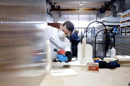 El metacrilato también está sirviendo de salida al sector de la publicidad y las artes gráficas. José Carlos Crevillén, gerente de una pequeña firma murciana, Gramur Publicidad, supo adaptarse rápido. “Días antes del estado de alarma empezamos a diseñar prototipos y el mismo sábado que se decretó ya vendimos 200 mamparas para farmacias de la región de Murcia”, relata este empresario de 26 años que desde entonces ha servido pedidos a Ferrovial, el Tribunal Supremo o la Audiencia Nacional. Como este caso y el de empresas como Grupo Zona, el futuro ya no es tan oscuro. “Quizá este año ya no sea tan malo”, dice José Domenech, a quien la crisis sanitaria le pilló tras una inversión de dos millones de euros en nueva maquinaria de impresión. Su salvación ahora es el metacrilato. Renovarse o morir.