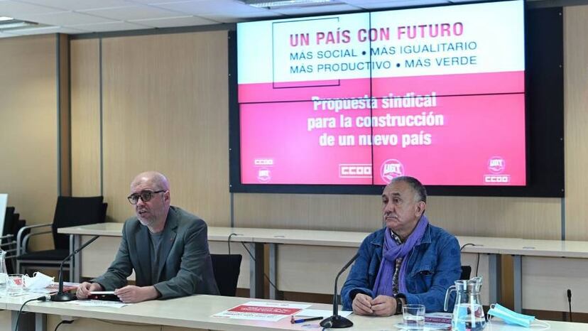 Los secretarios generales de CC OO y UGT, Unai Sordo y Pepe Álvarez, han presentado este jueves las líneas maestras de la Propuesta sindical para la construcción de un nuevo país, que explicarán en la próxima sesión de la comisión parlamentaria para la reconstrucción, y en la que se dibujan los distintos cambios estructurales que ambas organizaciones sindicales consideran necesarios para el diseño de un nuevo escenario económico y social pos-covid-19. Las centrales defienden regular el teletrabajo y mantener los ERTE.
