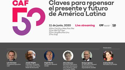 En ese contexto y como parte de la celebración del 50 aniversario de CAF, celebra un evento online “Claves para repensar el presente y el futuro de América Latina”, el cual reunirá a líderes que desde sus respectivos roles han tenido un papel fundamental en la respuesta a la crisis. Así, el debate, moderado por Andrea Bernal, periodista de la cadena NTN24, contará con la participación de Luis Carranza, presidente ejecutivo de CAF; Joseph Stiglitz, profesor de Economía de la Universidad de Columbia y premio Nobel de Economía; Ángel Gurría, secretario general de la OCDE; Alicia Bárcena, secretaria ejecutiva de la Comisión Económica para América Latina y el Caribe de CEPAL; y Enrique Iglesias, ex secretario general Iberoamericano y expresidente del BID.