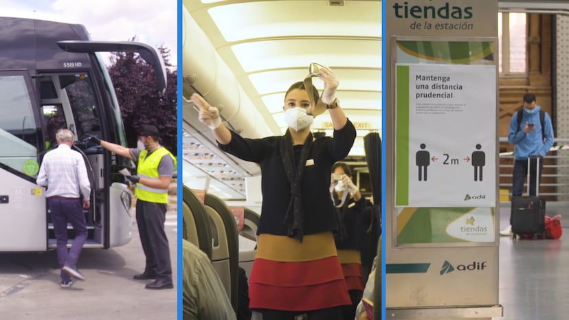 Las limitaciones a la movilidad de los ciudadanos acabaron este domingo con el fin del estado de alarma. Una circunstancia que coincide con el inicio del verano y el aumento de desplazamientos por las vacaciones. Tras reducir su capacidad hasta el 50% durante la crisis del coronavirus, el Gobierno ya permite el lleno total de los vehículos. Pero aun así, los medios de transporte colectivos han tenido que cambiar para adaptarse a las medidas de seguridad contra la covid-19. Este es un viaje en avión, barco, autobús y tren por la geografía española para conocer en primera persona la llamada nueva normalidad de los medios de transporte.