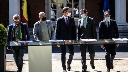 El espaldarazo de los empresarios para la negociación europea no solo estuvo en el documento de seis páginas que firmaron las tres partes. También en los discursos. “[El acuerdo] tiene una parte fundamental, queremos más Europa. El presidente tiene nuestro apoyo. Estamos aquí para sumar, por sentido de Estado”, señaló con contundencia Garamendi. Igual de claro fue el secretario general de CC OO, Unai Sordo: “Presentamos un acuerdo que traslada una idea de solidez de país, de solvencia. Lo traslada al exterior, a la UE. A nadie se le escapa que el compromiso tiene una traslación externa muy relevante”. “Este acto genera expectativas y confianza”, apostilló Pepe Álvarez, líder de UGT. “Ponemos en valor este acuerdo en un momento complicado para el país”, remató Gerardo Cuerva, de Cepyme.