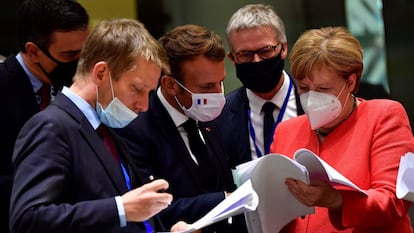 “Deal”, ha anunciado el presidente del Consejo Europeo, Charles Michel, a las cinco y media de la mañana. Un escueto mensaje en inglés en su cuenta de Twitter que remataba cinco días de cumbre europea, una de las más largas de la historia de la UE. El anuncio provocaba una cascada inmediata de declaraciones y reacciones, muchas de ellas poniendo el énfasis en el alcance del acuerdo. “¡Un día histórico para Europa!”, ha proclamado inmediatamente el presidente francés, Emmanuel Macron, uno de los artífices, junto a la canciller alemana, Angela Merkel, del mayor pacto financiero en la historia del club: 1,8 billones en total, incluidos los 750.000 millones de euros del fondo contra la crisis de la pandemia. “No fue fácil, pero al final nos encontramos”, ha afirmado Merkel. A juicio de la canciller, “Europa ha demostrado que es capaz de abrirse camino en una situación tan especial”.
