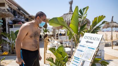 Con bañador y mascarilla, Miguel Freire se detiene a la entrada de un chiringuito, aún empapado por el primer baño de mar de las vacaciones. Lee el cartel de las medidas anticovid adoptadas por el chiringuito Palapa Beach de El Puerto de Santa María, la ciudad gaditana en la que el emeritense y su familia veranean cada año. “No íbamos a venir, por miedo y respeto. Al final, hemos bajado tres días, la mitad de lo habitual”, explica el turista, antes de seguir sin entrar en el establecimiento. No es el único que pasa de largo. Los 35 grados del mediodía caen a plomo y, aunque el chiringuito parece sacado de una foto de Instagram, está prácticamente vacío.