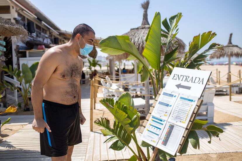Con bañador y mascarilla, Miguel Freire se detiene a la entrada de un chiringuito, aún empapado por el primer baño de mar de las vacaciones. Lee el cartel de las medidas anticovid adoptadas por el chiringuito Palapa Beach de El Puerto de Santa María, la ciudad gaditana en la que el emeritense y su familia veranean cada año. “No íbamos a venir, por miedo y respeto. Al final, hemos bajado tres días, la mitad de lo habitual”, explica el turista, antes de seguir sin entrar en el establecimiento. No es el único que pasa de largo. Los 35 grados del mediodía caen a plomo y, aunque el chiringuito parece sacado de una foto de Instagram, está prácticamente vacío.