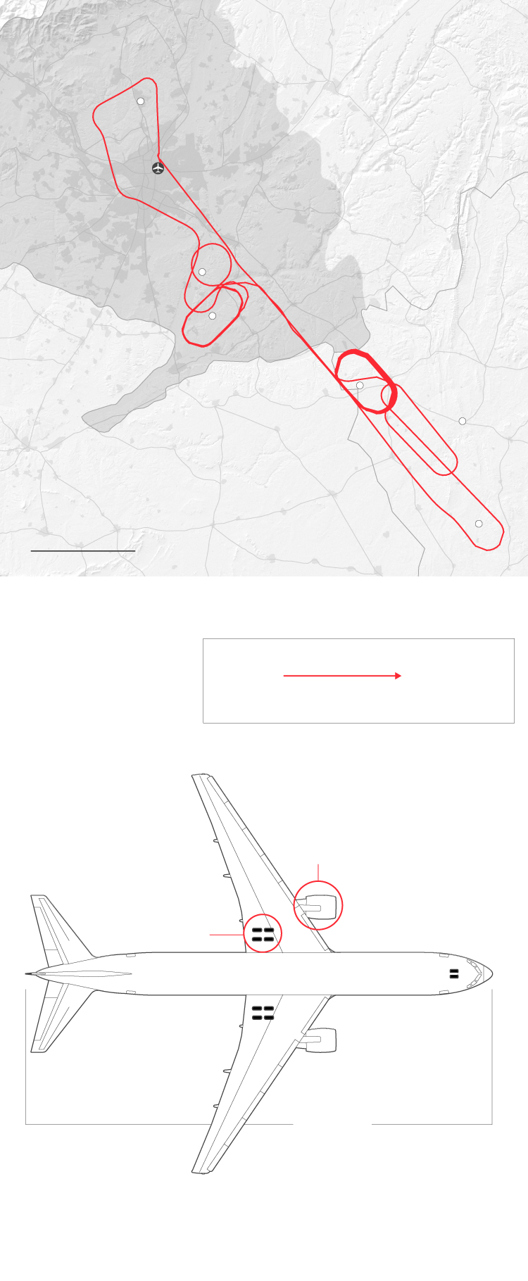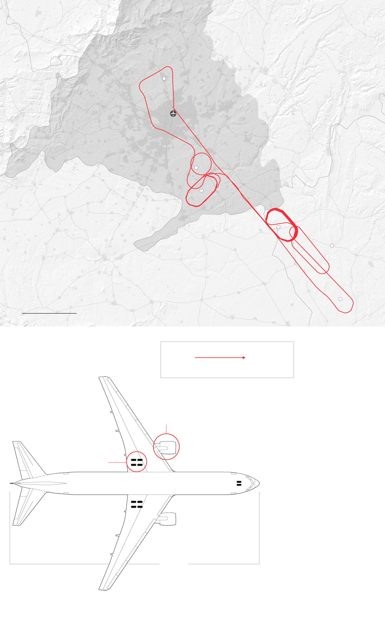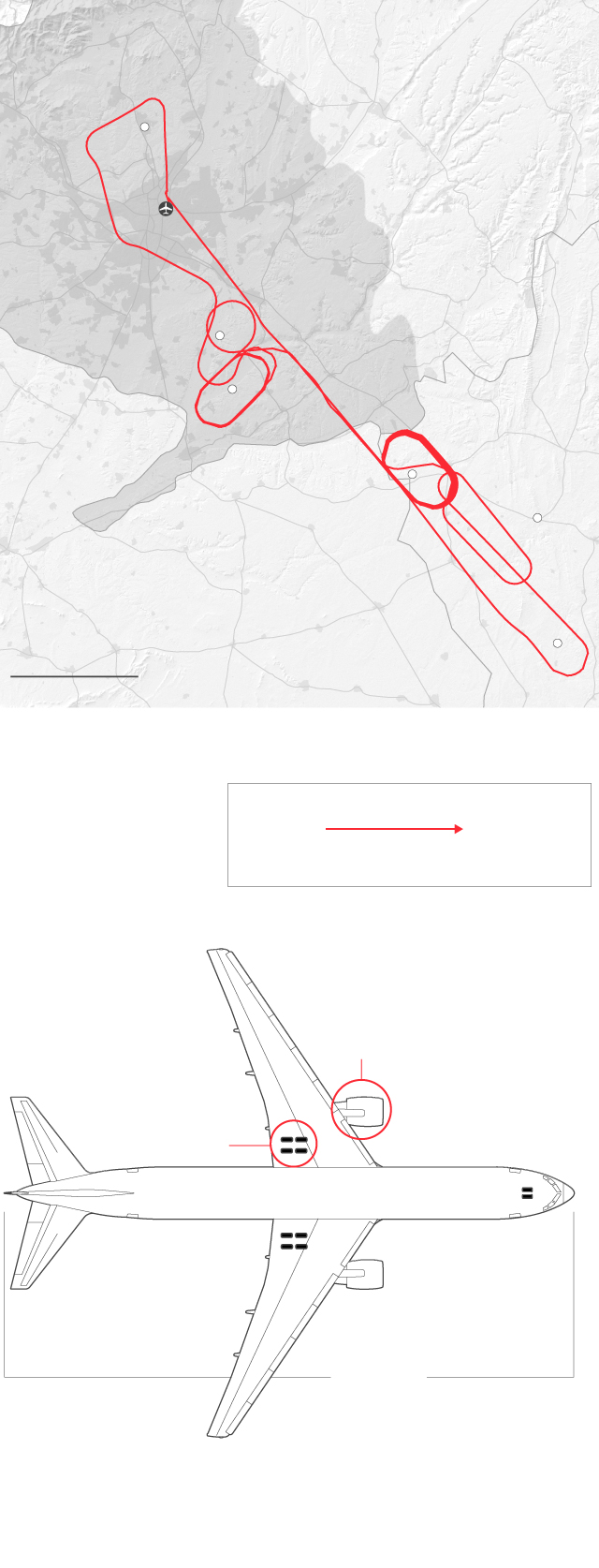 En esta maniobra, el avión sobrevoló primero el sur de Madrid y luego se dirigió a Chinchón (Madrid) y Tarancón (Cuenca), donde continuó dando vueltas. La altura media a la que ha volado es de 2.300 metros, con una velocidad de 550 kilómetros por hora, aunque en determinados momentos ha descendido hasta los 800 metros, despertando el interés de los habitantes de las zonas sobrevoladas, que han subido numerosas fotos y vídeos a las redes sociales.