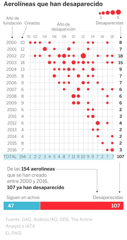 Los datos parecen avalar la tesis del directivo español que rescató a Iberia de la quiebra. De las 154 aerolíneas que se han creado entre 2000 y 2016 al calor del boom del bajo coste, 107 ya han desaparecido. La danesa Primera Air y la chipriota Cobalt Air cerraron en 2018 con nueve y dos años de vida, respectivamente. Wow Air, fundada en 2011, quebró el año pasado. Y lo mismo sucedió con otras características de los vuelos chárter como la británica Monarch. En 2019, dejaron sus aviones en tierra Germania, Thomas Cook, Adria Airways, Aigle Azur y XL Airways. Fuera de Europa, siguieron el mismo camino la india Jet Airways o la brasileña Avianca.
