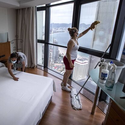Dos turistas entran en el hotel Conquistador de Tenerife después de que el empleado de seguridad les haya tomado la temperatura. Son polacas (hay un vuelo directo). La reapertura la semana pasada del establecimiento ha permitido que Inés Grillo vuelva a tener clientes en su tienda de ropa, Oliver’s Boutique. “De unos 200 al mes pasé a cero. La playa de las Américas parecía una ciudad fantasma, no se oía nada, podías salir desnudo a la calle que nadie te iba a ver. Ahora esto empieza a despegar. Necesitamos que amplíen los vuelos y que lleguen por fin las ayudas prometidas”. Sus cuatro empleadas, de momento, siguen en el ERTE. La propietaria del local de la tienda relajó los pagos y ella hizo lo mismo donde es arrendadora.