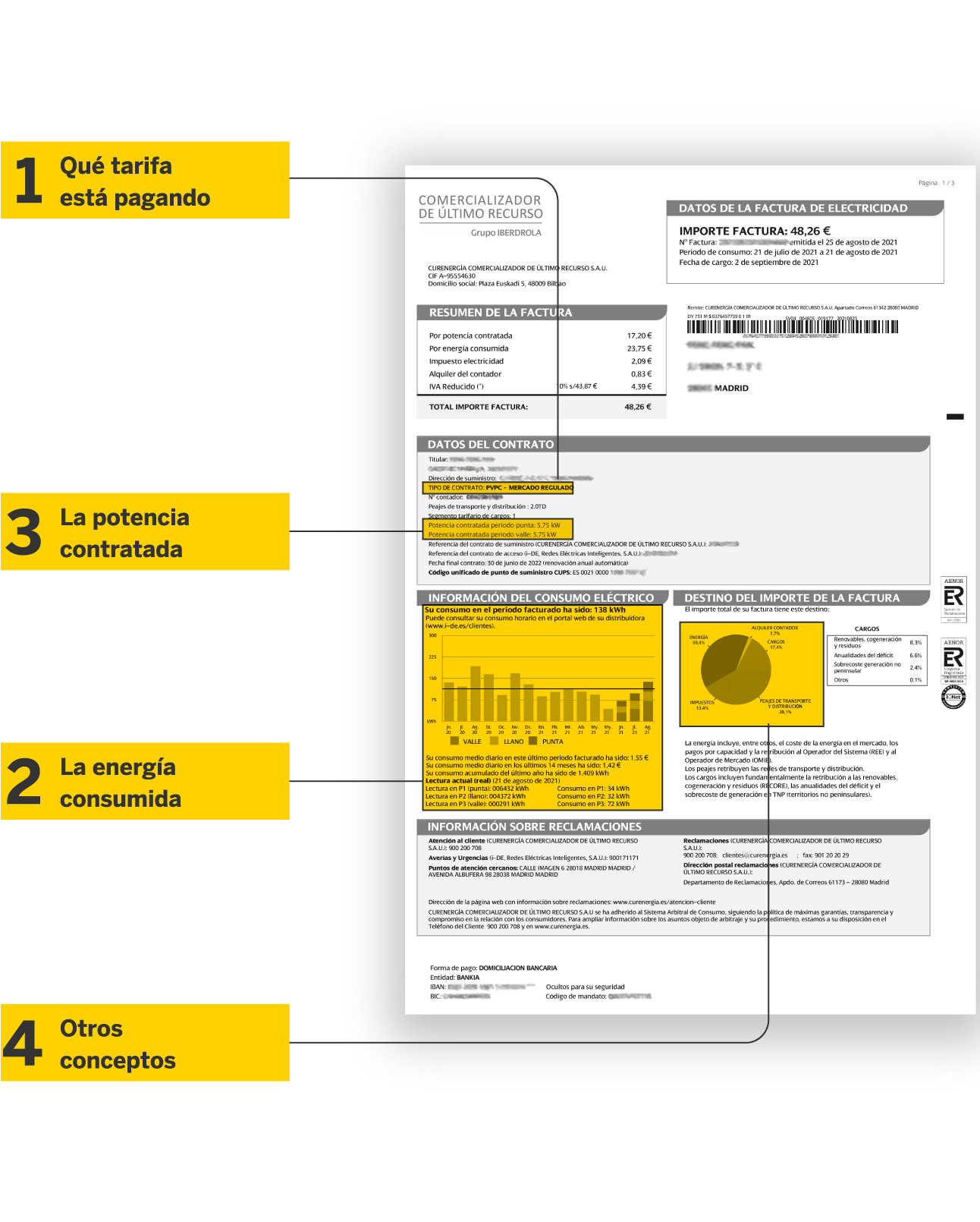 Lo primero en lo que hay que fijarse en la factura es en el tipo de tarifa. Maite, al igual que el 38% de los consumidores domésticos del país, paga la modalidad PVPC, siglas que significan precio regulado voluntario al pequeño consumidor, más expuesta a la volatilidad del mercado. Permite beneficiarse de mejores precios cuando el megavatio hora del pool, como se conoce al mercado mayorista, está barato, pero en estos meses de subida desbocada los consumidores salen perjudicados. Introducida por el Gobierno del PP en 2014, esta tarifa establece de forma muy concreta lo que la comercializadora debe repercutir en el precio final de la factura (que recoge más conceptos que el consumo de electricidad). En teoría, esto debería garantizar que no se pague de más, pues en el caso de las tarifas de mercado libre, en el que está el otro 62% de los consumidores españoles, y donde se acepta un precio de antemano con las eléctricas que suele ser algo más alto, cada contrato es un mundo, y puede haber sorpresas. Sin embargo, en la tarifa regulada el precio de la parte correspondiente a la electricidad está vinculada a la cotización del mercado mayorista, lo que hace que esté mucho más expuesta a los vaivenes del pool, un quebradero de cabeza ahora mismo.