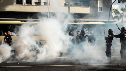 Una pancarta ajada se arremolina en el asfalto entre trozos de cristales, pelotas de goma y restos de botes de humo. Poco antes rezaba ‘La juventud con la lucha del metal’, aunque ahora es un guiñapo pisoteado en medio de una batalla campal de objetos que sobrevuelan las cabezas con violencia. La manifestación, de 4.000 personas para los convocantes y de 1.300 según la policía, en apoyo al sector del metal de Cádiz acaba opacada entre gas lacrimógeno y cargas policiales a una parte de los huelguistas, dispersos a modo de guerrillas por diversos barrios de la capital. Justo lo contrario a lo que los sindicatos mayoritarios (UGT y CCOO) aspiraban en el octavo día de la huelga indefinida, que ha acabado convertido en la jornada de disturbios más graves desde que comenzaron las protestas a cuenta de la renovación de un convenio colectivo.