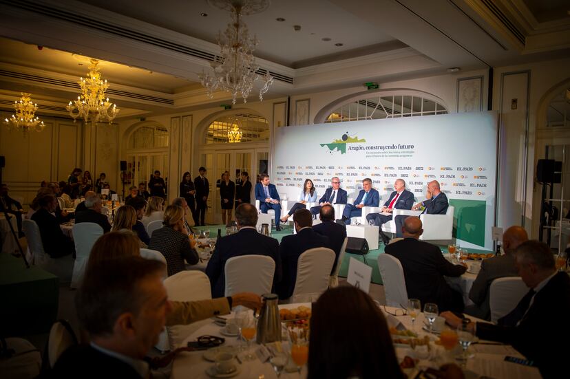 Avanza la mañana en el Hotel Palace de Madrid, donde se celebra este evento, que lleva por subtítulo Un encuentro sobre los retos y estrategias para el futuro de la economía aragonesa. El público se distribuye en torno a mesas bien provistas de un desayuno con productos maños. Aceites con denominación de origen de la tierra, frutas locales, Trenza de Almudévar, jamón de Teruel. Entre los invitados figuran la ministra de Educación, Pilar Alegría, nacida en Zaragoza, y Carlos Núñez, presidente ejecutivo de PRISA Media.