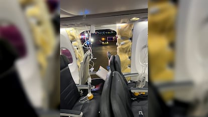 El vuelo de Alaska Airlines despegó de Portland, en el noroeste de Estados Unidos, el viernes a las 17.00, hora local, rumbo a Ontario, en California, pero tuvo que regresar unos 20 minutos después tras señalarse “un problema de presurización”, según ha explicado la FAA en la red social X. Las imágenes que se han publicado en internet muestran máscaras de oxígeno colgando del techo del aparato y la parte trasera izquierda del fuselaje con un agujero que parece el hueco para una puerta de emergencia, aparentemente no habilitada. En el interior del avión, parte de la pared de la cabina también se desgarró, dejando al descubierto material aislante.