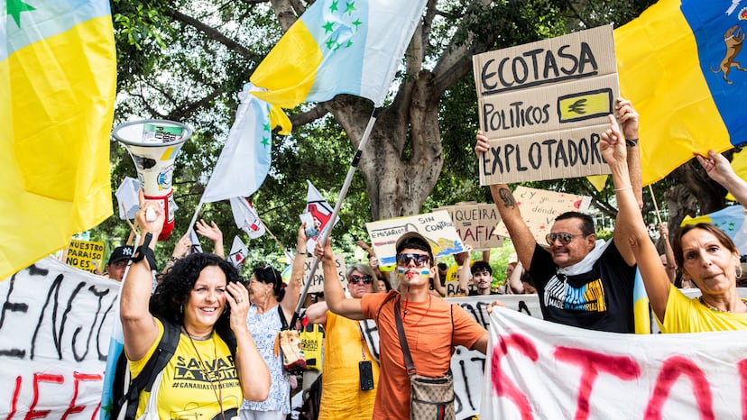 “Nos están expulsando de nuestra tierra, no tenemos perspectivas para vivir aquí con sueldos de miseria y alquileres por las nubes”, recalcaba en Santa Cruz de Tenerife Fátima Cabrera, estudiante de Psicología de 19 años que vive en un piso con otros estudiantes en la ciudad universitaria de La Laguna. “Necesitamos un cambio completo del modelo económico”, explica Antonio Bueno, de 55 años, sujetando con firmeza una de las pocas banderas españolas que se han podido ver en la manifestación. “El que tenemos en Canarias va en contra de la calidad de vida de los canarios. No es sostenible seguir así, con atascos continuos o alquileres imposibles de pagar”.
