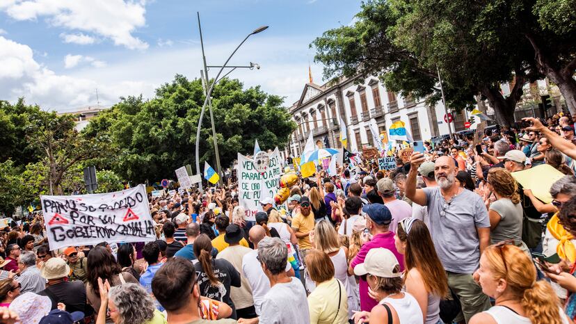 Canarias cerró 2023 con una facturación turística de 22.000 millones de euros, la más alta de su historia, con más de 16 millones de visitantes. Esta es la cara brillante. Hay otra que no lo es tanto: los sueldos en las islas son los segundos más bajos del país (1.630 euros al mes de media), tiene la tercera tasa de paro más alta (16,2%, según la última EPA del INE), la segunda inflación más alta (3,5%, frente al 3,2% nacionalsegún el último dato del Instituto Nacional de Estadística) y la segunda tasa de riesgo de pobreza más alta (26,1%). Es la cuarta comunidad con el precio más alto de alquiler por metro cuadrado, y Santa Cruz de Tenerife es la segunda provincia donde más crecieron los precios en el último año, según Idealista. Este panorama ha llevado a que el Gobierno canario haya llegado, incluso, a aplaudir la protesta. En los últimos días, el presidente Fernando Clavijo, alentó que la sociedad “salga y exprese su malestar” y aceptó la necesidad de repensar el modelo y hacerse preguntas como imponer topes de turistas.