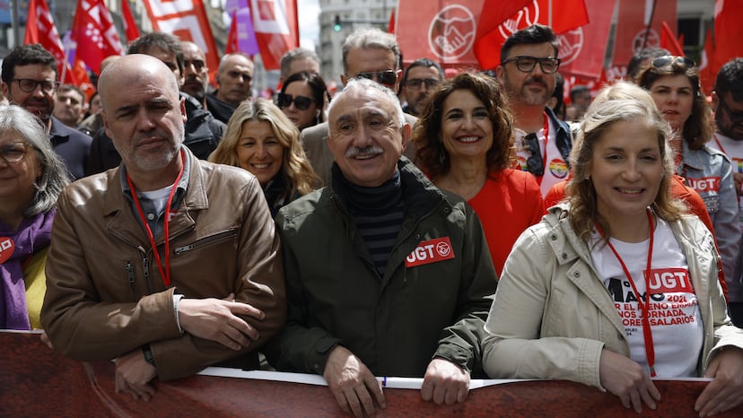 Miles de personas se han unido este miércoles a las manifestaciones por el Primero de Mayo, Día Internacional de los Trabajadores, convocadas por los sindicatos mayoritarios, UGT y CC OO, en más de 70 ciudades de toda España. Los secretarios generales de ambas centrales, Pepe Álvarez y Unai Sordo, han encabezado la marcha en Madrid, donde han estado acompañados por unas 10.000 personas, según cálculos de la Delegación de Gobierno, y por una nutrida representación del Gobierno de coalición. Las vicepresidentas María Jesús Montero, Yolanda Díaz y Teresa Ribera, y los ministros de Cultura, Ernest Urtasun; Seguridad Social y Migraciones, Elma Saiz; Sanidad, Mónica García; Transportes, Óscar Puente; y Derechos Sociales y Consumo, Pablo Bustinduy, se han unido a los líderes sindicales en la cabecera de la procesión, y han desfilado conjuntamente tras la pancarta con el lema Por el pleno empleo: menos jornada, mejores salarios.