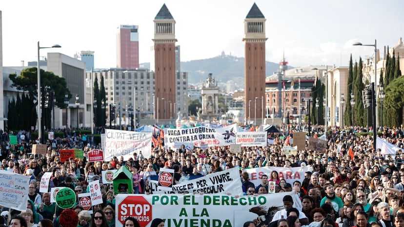 El malestar por la crisis de la vivienda en España se extiende. Después del ciclo de protestas en verano y otoño del año pasado, este sábado 40 ciudades del país vivieron nuevas manifestaciones en una convocatoria unitaria de los sindicatos de inquilinas que congregó a decenas de miles de personas bajo el lema “Acabemos con el negocio de la vivienda”. En Madrid, el Sindicato de Vivienda cifró los asistentes en 100.000 y la delegación del Gobierno en 15.000. En Barcelona se concentraron 100.000 personas según el sindicato y 12.000 recontó la Guardia Urbana. Los participantes constataron que las administraciones van tarde cuando toman medidas y les exigieron que actúen con contundencia para frenar los precios. En Barcelona, la portavoz del sindicato de la ciudad, Carme Arcarazo, advirtió “a los gobiernos” de que “si no se plantan contra el poder inmobiliario, la crisis de vivienda se les llevará por delante”. También salieron a la calle Sevilla, Málaga, San Sebastián, Santiago de Compostela, Las Palmas de Gran Canaria, Palma de Mallorca o Valencia. No había una convocatoria de ámbito estatal desde los años previos al estallido de la burbuja, en 2006 y 2007.