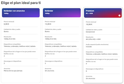 Los aspectos como el número de dispositivos que pueden acceder simultáneamente o la calidad de la imagen todavía marcan la diferencia entre los planes sin publicidad: los llamados estándar, que por regla general permiten dos pantallas al mismo tiempo en alta definición (HD, por sus siglas en inglés), y los premium, cuatro pantallas en “ultra” alta definición.