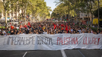 También ha habido una manifestación esta tarde en Barcelona, marcada por la tensión entre un grupo de manifestantes y los Mossos d’Esquadra. La marcha, que salía de la estación de Sants, ha vivido el primer momento complicado cuando varios manifestantes han intentado impedir la salida del autobús del equipo de baloncesto del Hapoel Jerusalén israelí, que se enfrenta esta noche contra el Baxi Manresa. Los Mossos han tenido que usar gas pimienta para disolverlos. La CUP ha denunciado que uno de sus diputados, Xavier Pellicer, ha sido “arrastrado” por el suelo en ese incidente, informa Lorraine Delorenzo. Otro episodio de tensión se ha vivido justo al arrancar la manifestación, cuando un grupo de jóvenes ha quemado dos contenedores a la altura de la estación de metro Tarragona, provocando un humo negro que se ha extendido rápidamente por la zona y provocando inquietud entre los 15.000 manifestantes, según la Guardia Urbana. Al término de la manifestación, los Mossos d’Esquadra han informado de 15 detenciones por desordenes públicos y daños a contenedores y a establecimientos.