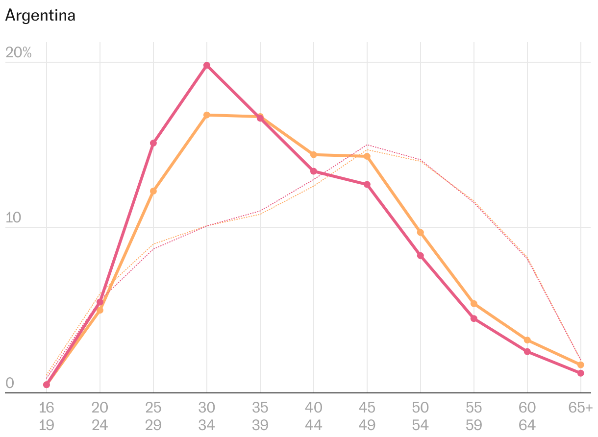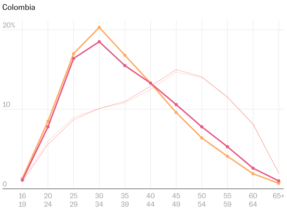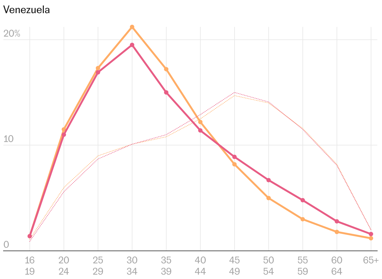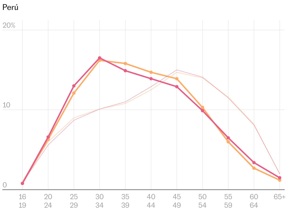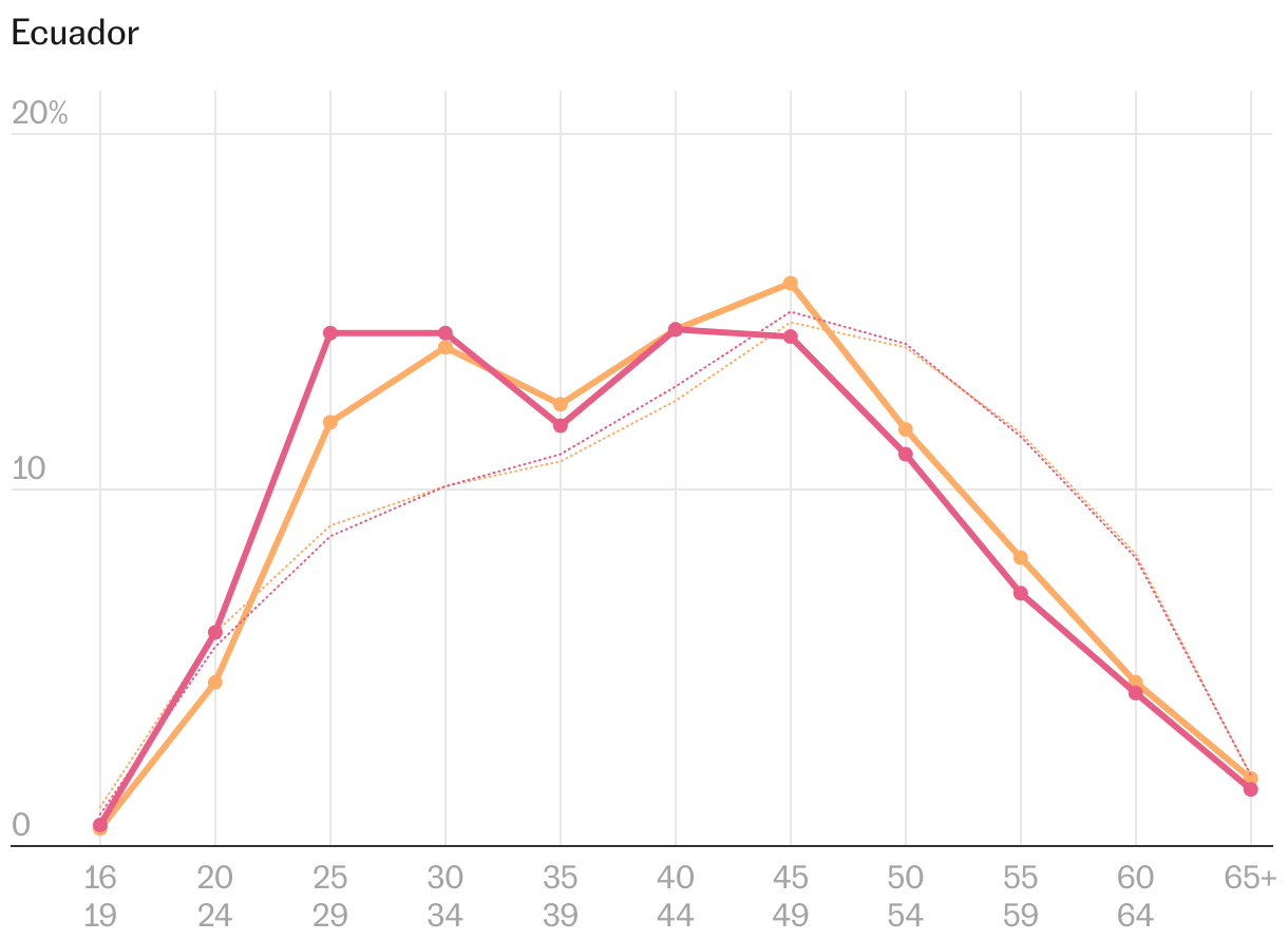 Más allá de las diferencias regionales, la desagregación por edad también ayuda a entender la migración latinoamericana a España. Las comunidades que más crecen en los últimos años (Venezuela, un 237% más desde 2019; Colombia, +228%; Perú, +154%; y Argentina, +85%) son las que cuentan con afiliados más jóvenes a la Seguridad Social. En torno a la mitad tienen 34 años o menos. Sin embargo, en la comunidad que menos nuevos afiliados aporta (Ecuador, que solo crece un 0,2%) ese grupo de jóvenes representa en torno a un tercio del total. Por ello, como se observa en el siguiente gráfico, la línea de edad ecuatoriana es la que más se parece a la del promedio de la economía, envejecida principalmente por los españoles.