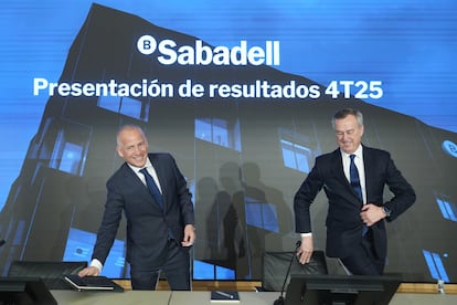 El Banco Sabadell alcanzó un beneficio neto de 1.775 millones en 2025, según consta en los resultados que la entidad catalana ha publicado este viernes. El año en el que logró salvar la opa hostil que le había lanzado el BBVA resultará ser también el último con César González-Bueno al mando de la entidad, después de que este jueves se informara de que le sustituirá Marc Armengol en el puesto de consejero delegado. Y esa etapa se cerrará con un plan de recompra de acciones por un importe de hasta 800 millones de euros. El Banco Central Europeo ya ha dado el visto bueno a ese programa, que se activará el próximo lunes, 9 de febrero. Esta cifra se compone de 365 millones de euros con cargo a resultados de 2025, más 435 millones de euros del exceso de capital generado por encima del 13%. Las acciones de Banco Sabadell han liderado los descensos del Ibex 35 en la jornada bursátil de este viernes y han cerrado con una caída del 4,7%.