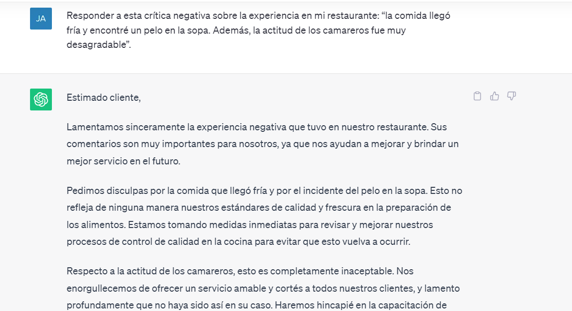 Además de correos electrónicos, ChatGPT puede elaborar respuestas de los comentarios negativos que los clientes vuelquen en internet sobre nuestro negocio. Habitualmente, los responsables no tienen tiempo de responder a todas las reseñas o las reclamaciones que se generan, de manera que la IA proporciona nuevas ideas sobre cómo contestar de una manera educada y creativa, lo que ahorrará mucho tiempo.
