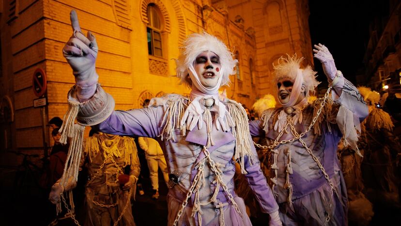 “Es un fantasma que te puede dar miedo y, a la vez, irte a tomar una cerveza con él”. El artesano del Carnaval de Cádiz y gerente de Achicarte, Juan Diego Aragón, dice que esa era la idea que tenía en la cabeza cuando diseñó la caracterización —o tipo, en argot carnavalero— de Los mi alma, la última creación de la chirigota sevillana —ahí el doble sentido— de Antonio Álvarez, Bizcocho. Y no le falta razón. Tras presenciar en directo su metamorfosis a base de maquillaje, lentillas y disfraz, los 15 componentes de la agrupación dan respeto de lejos. Pero, de cerca y al arrimar el oído, el terror se disipa a golpe de ingenio en unos espectros a medio camino entre Beetlejuice y unos chirigoteros clásicos que explotan el humor más irreverente.