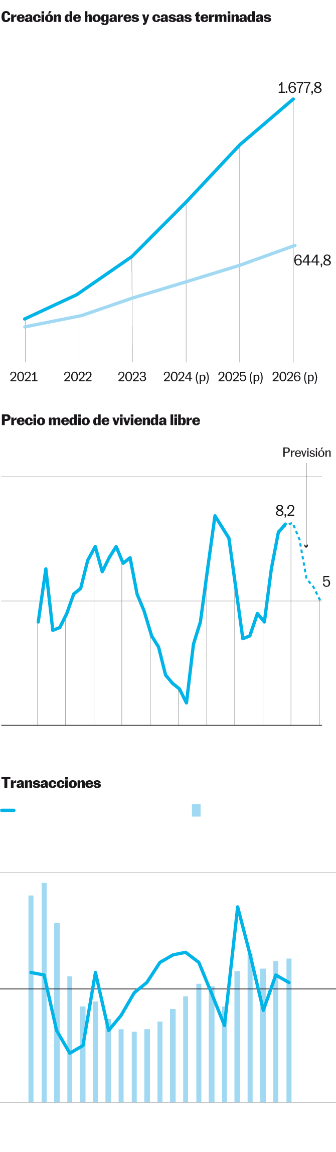 Esto supone un reto para la economía. Palabras mayores. “La escasez de vivienda restringe la mejora en la calidad de vida y puede entorpecer la inmigración, lo que resulta preocupante ante la caída de la población activa de nacionalidad española”, avisan en BBVA Research, que calcula que para 2026 el déficit alcanzará el millón de casas. No obstante, parece que algo empieza a moverse. El número de visados ha pasado de un promedio mensual de 9.125 en 2023 a 10.550 en los primeros nueve meses de 2024. “Este año acabaremos con unas 110.000 viviendas nuevas terminadas y en 2025 crecerán entre el 10% y el 15%, pero deberíamos estar construyendo 250.000 unidades al año mínimo”, comenta Xavier Vilajoana, presidente de la Asociación de Promotores y Constructores de España. No es suficiente, porque el proceso de producción de inmuebles es de ciclo largo. “La vivienda nueva que se haga ahora se verá en 2026 y en 2027″, dice Vilajoana.