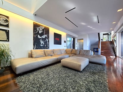 Se compone de dos edificios conectados y distribuidos en tres plantas que acogen siete dormitorios y ocho baños, así como sale de cine, cocina abierta, salón con chimenea y bodega, entre otras estancias. En la planta baja se encuentra una zona de bienestar que incluye sauna, baño de vapor, piscina climatizada y jacuzzi.