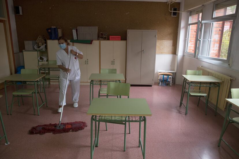 Las horas previas a la reapertura de las clases en los institutos madrileños de secundaria (comienzan mañana) se viven con incertidumbre. Los de infantil y primaria empiezan ya este martes (como ya hicieron en los días previos los escolares de Navarra, Comunidad Valenciana, Cantabria, La Rioja, Aragón y País Vasco). Los profesores madrileños se reencuentran con sus compañeros entre pasillos en los que se colocan pegatinas para garantizar el flujo de los alumnos, y con un baile de transportistas que llevan los pupitres de un aula a otra. Para acceder a uno de los institutos de la ciudad de Alcalá de Henares es imprescindible no tener fiebre ni febrícula. Una mujer lo comprueba mediante un termómetro de infrarrojos. El profesor bromea sobre su baja temperatura corporal:
