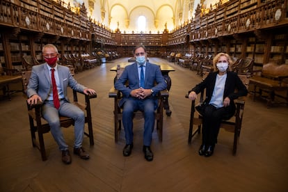 En una tierra, Castilla y León, que no se anda con miramientos los rectores de la Universidad de Salamanca (USAL) y Pontificia de Salamanca y el alcalde del PP se han conjurado para mantener las aulas abiertas, cumpliendo, claro, las normas sanitarias. Ricardo Rivero, Mirian Cortés y Carlos García Carbayo están dispuestos a enfrentarse para ello a los estudiantes díscolos, los colegios mayores o a algunos bares. EL PAÍS citó este martes a los tres gestores para hablar de este intrincado curso académico, vital para una población de 145.000 habitantes que se conserva eternamente joven gracias a sus 32.000 universitarios y sus 34.000 estudiantes de español.