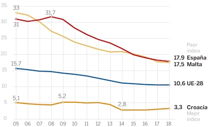Ernesto Gutiérrez-Crespo es orientador en el Centro Integrado de FP Elorrieta-Erreka Mari de Bilbao. El País Vasco se enorgullece de tener por tradición una tasa baja de abandono temprano de las aulas (el 7,3% de los jóvenes tienen como mucho el título de ESO), cuando la española sonroja y lidera la cola en Europa con un 17,9%. Gutiérrez, pedagogo y psicólogo, no duda de la razón: “En Euskadi la inversión es mucho mayor. Y eso se ve en las ratios por clase, en la atención a la diversidad, el apoyo...”. Si España quiere mejorar sus índices ―ya no cumple la meta que le marcó la UE del 15% de abandono este año― no queda otra que invertir más en la formación, porque en esto también somos farolillo rojo. La ayuda a los rezagados menguó un 90% en los años del ministro de Educación popular José Ignacio Wert. El Gobierno se ha comprometido a aumentar el gasto hasta llegar al 5% del producto interior bruto en 2025. En 2017, último año del que hay datos, supuso el 4,24%.