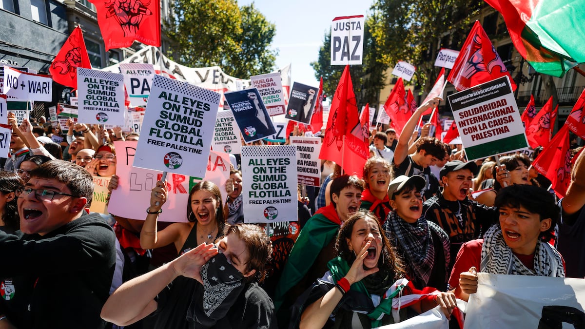 Barcelona ―con un vínculo especial con la flotilla, ya que zarpó de esta ciudad y en ella viajaba la exalcaldesa Ada Colau― ha vivido una de las manifestaciones estudiantiles más numerosa de los últimos años. Unas 6.500 personas, según la Guardia Urbana, han marchado por el centro de la capital catalana ―300 más en Tarragona― hasta la plaza Sant Jaume, sede de la Generalitat. Donia Armani, de origen marroquí y estudiante de FP, ha acudido acompañada de su madre. “Lo que puedo hacer es estar aquí, con mi presencia. Cuanta más gente, mejor; así los palestinos no estarán solos”, ha señalado. “Los palestinos son como un pueblo hermano, sentimos mucho con las imágenes absurdas que vemos”, ha añadido su madre.