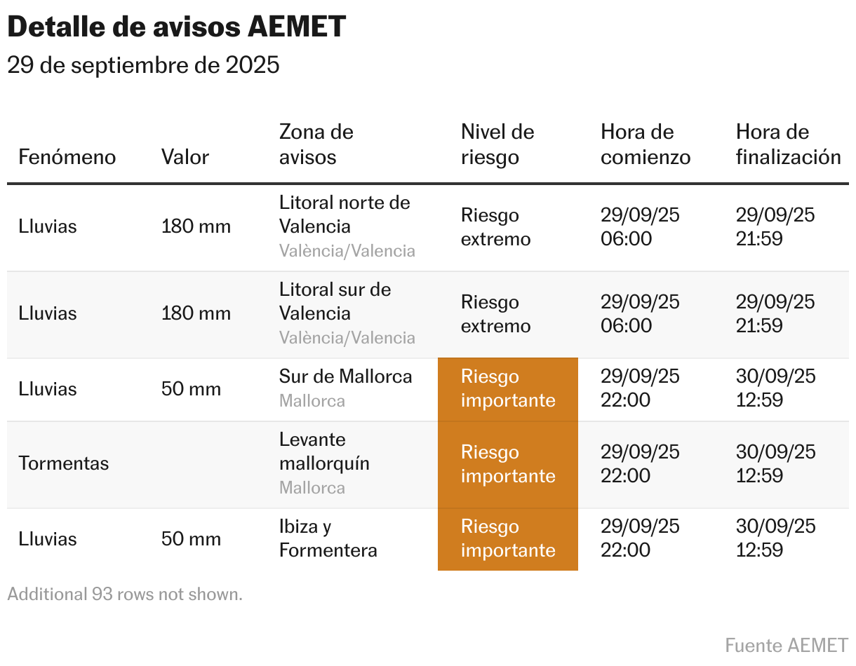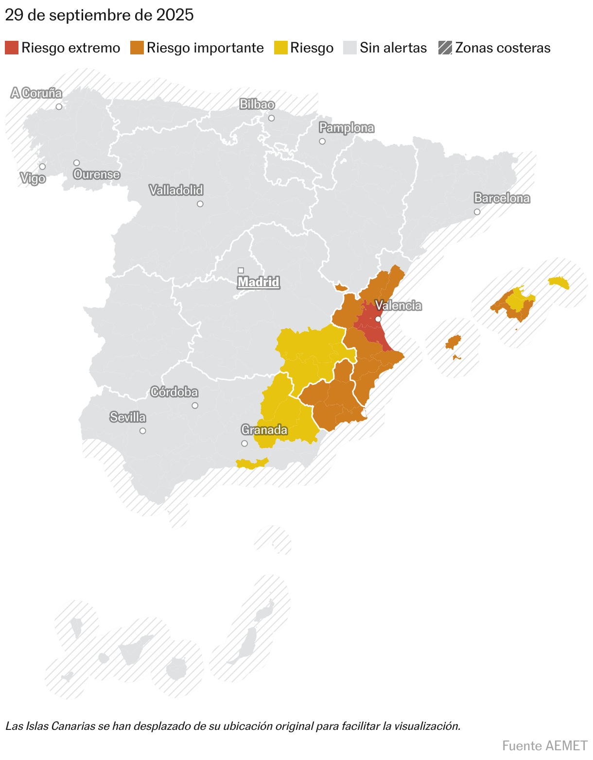 Con los avisos rojos activados el domingo por la Aemet, los gobiernos valenciano y catalán enviaron en la tarde de este mismo día mensajes a los móviles alertando de las fuertes lluvias. “El aviso rojo implica un peligro extraordinario, con riesgo de inundaciones y graves impactos en bienes y personas”, apuntaba el domingo Rubén del Campo, portavoz de Aemet. “Se recomienda no viajar, salvo que sea necesario y mantenerse informado de la situación meteorológica y de los avisos en vigor”, sostuvo.
