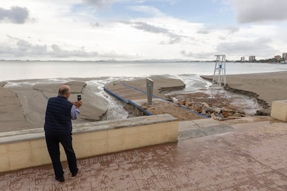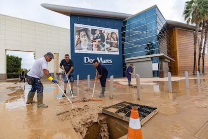 Personal del Ayuntamiento de Los Alcázares (Murcia) despeja un acera cubierta de vegetación tras la lluvia, este sábado. Vídeo: EPV