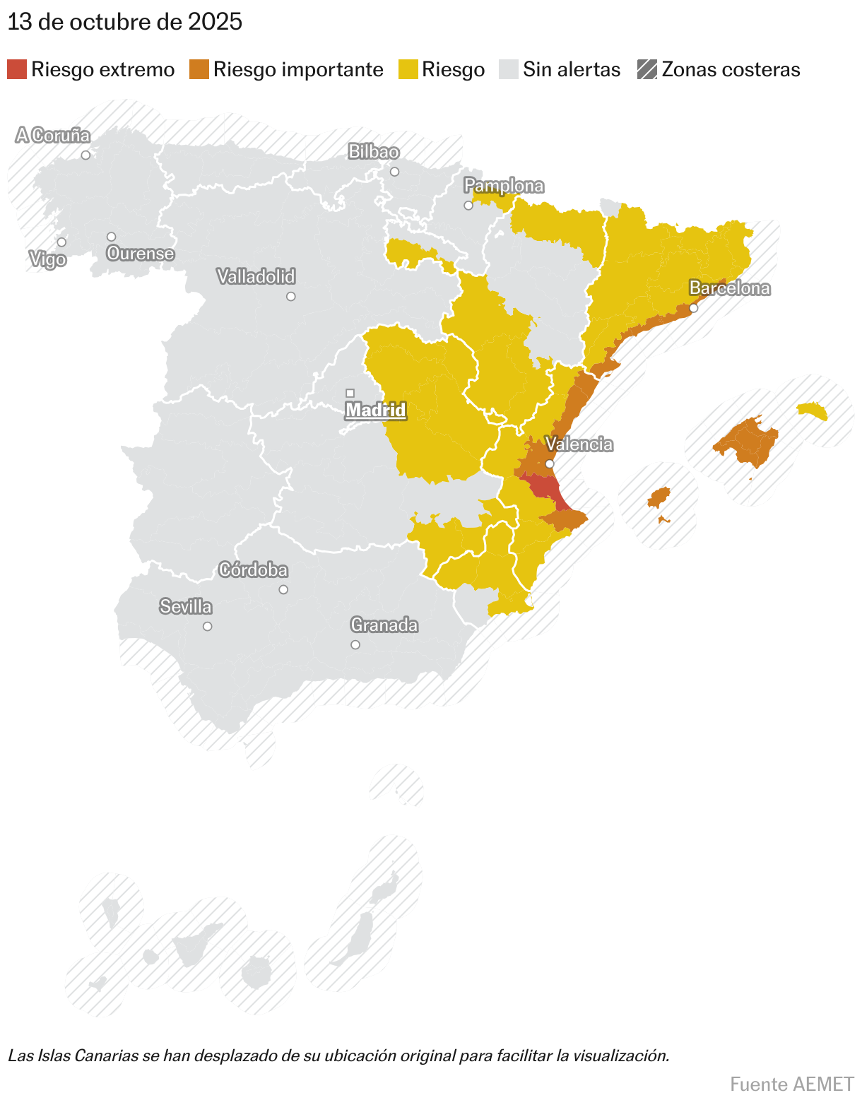 Durante la jornada, la influencia de una masa de aire frío en altura mantendrá la atmósfera inestable en buena parte del país. En la primera mitad del día se prevén chubascos y tormentas en los litorales catalanes, que se extenderán desde la mañana a zonas costeras y prelitorales entre Barcelona y el norte de Alicante, con especial intensidad en el tramo entre Tarragona y Valencia. Desde el mediodía, las tormentas podrán alcanzar los Pirineos, el sistema Ibérico y áreas cercanas de Castilla-La Mancha, y por la tarde llegarán también a las Pitiusas.