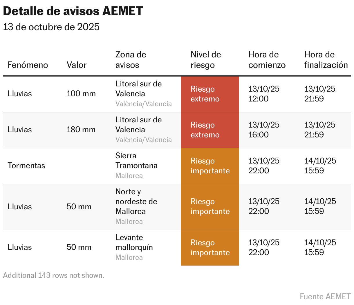 La Agencia Estatal de Meteorología (Aemet) ha lanzado este lunes un aviso rojo por lluvias torrenciales para el litoral sur de Valencia. Además, continúan las advertencias de color naranja para buena parte del Mediterráneo peninsular y Baleares por chubascos muy fuertes y persistentes.